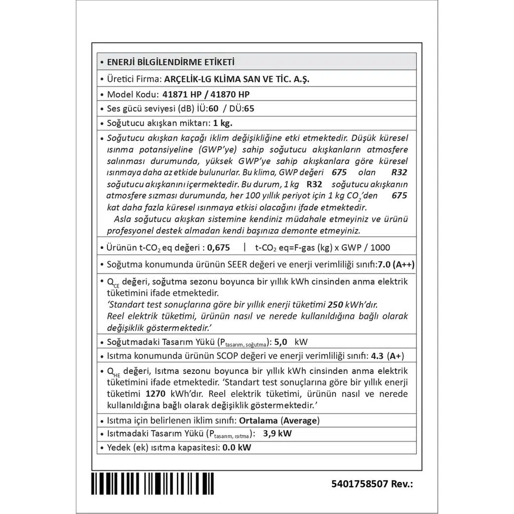 Beko 41870 HP 18000 BTU A++ Duvar Tipi Klima