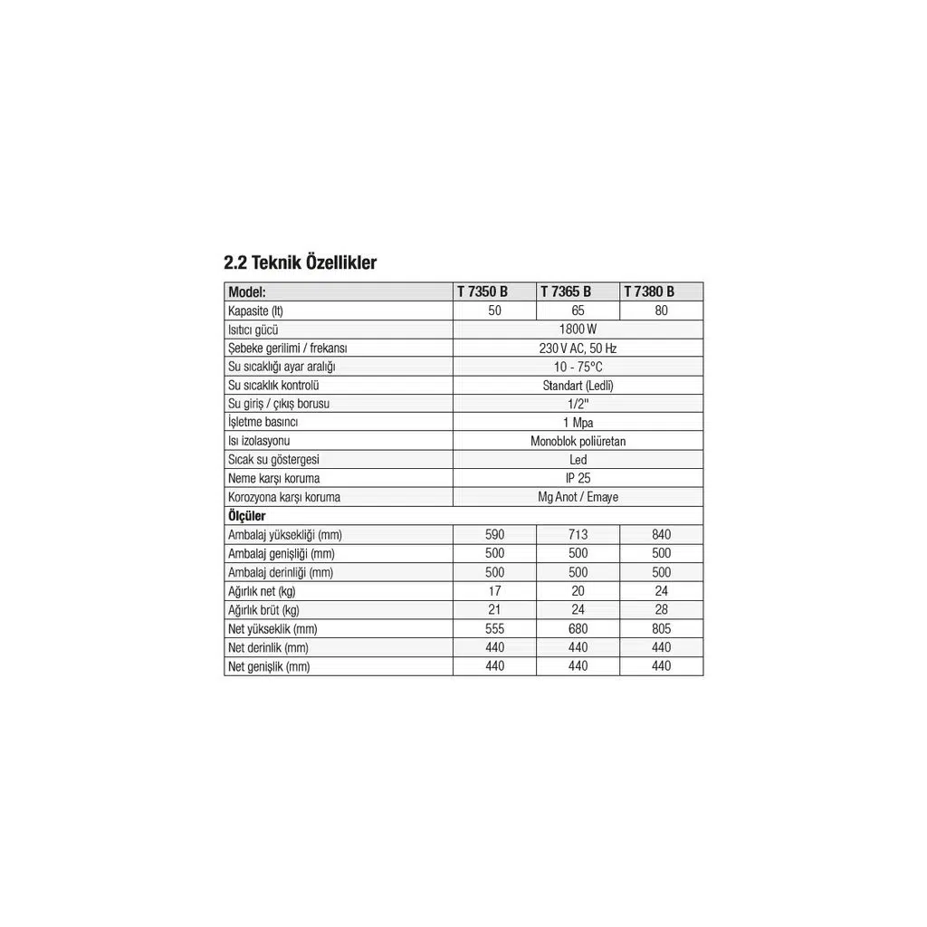 Sıcaklık Ayar Aralığı(˚C): 10-75 Akıllı Hafıza Var Koruma sınıfı :IP 25 Korozyona Karşı Koruma :Var Titanyum Emaye Kaplamalı Kazan: Var ] Donma Emniyeti: Var Yüksek basınç emniyet valfi: Var Aşırı Isınma Emniyeti: Var Susuz Çalışma Emniyeti: Var ] İzolasyon :Monoblok Poliuretan Fiş Tipi: Avrupa Tipi Frekans :50 Beko Bkt 650 B Termosifon Özellikleri Su Kapasitesi65 litreEnerji SınıfıCIsıtma Gücü1800 WYükseklik76 cmGenişlik44 cmDerinlik44 cmDiğerGaranti Süresi (Ay)36Yurt Dışı SatışYokStok KoduHBV000001CSF5